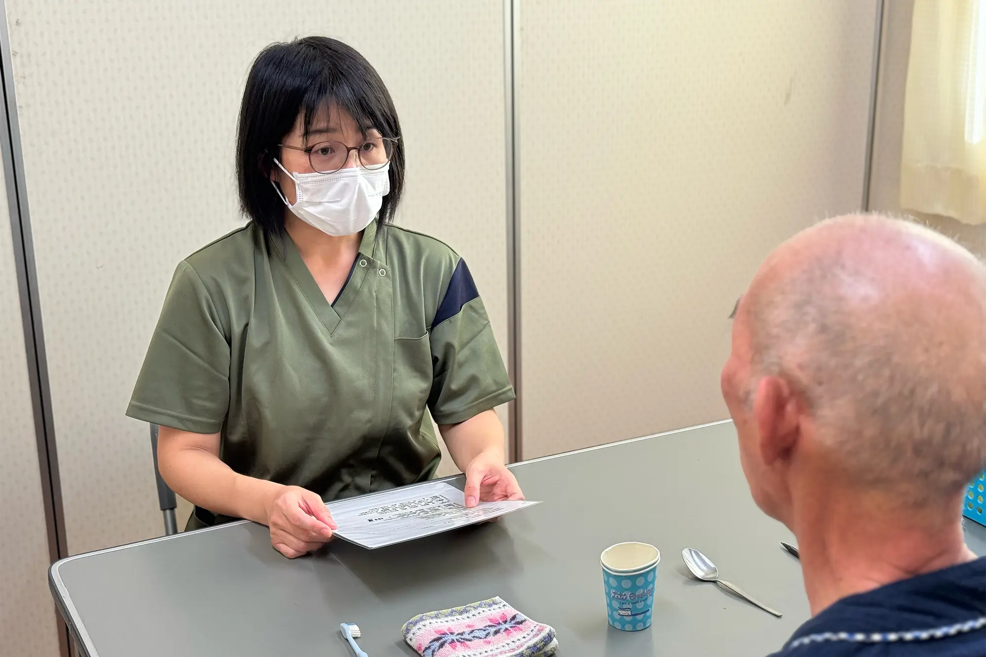 当院の言語聴覚療法では、加齢や疾患の影響で飲み込みが悪くなった方への評価・訓練・食事指導を行います。患者・利用者様のQOL、ご家族の希望も大切にして、摂食嚥下認定看護師と連携して取り組みます。また、言語障害の方にも、コミュニケーション能力を高める訓練や方法を考え、支援します。