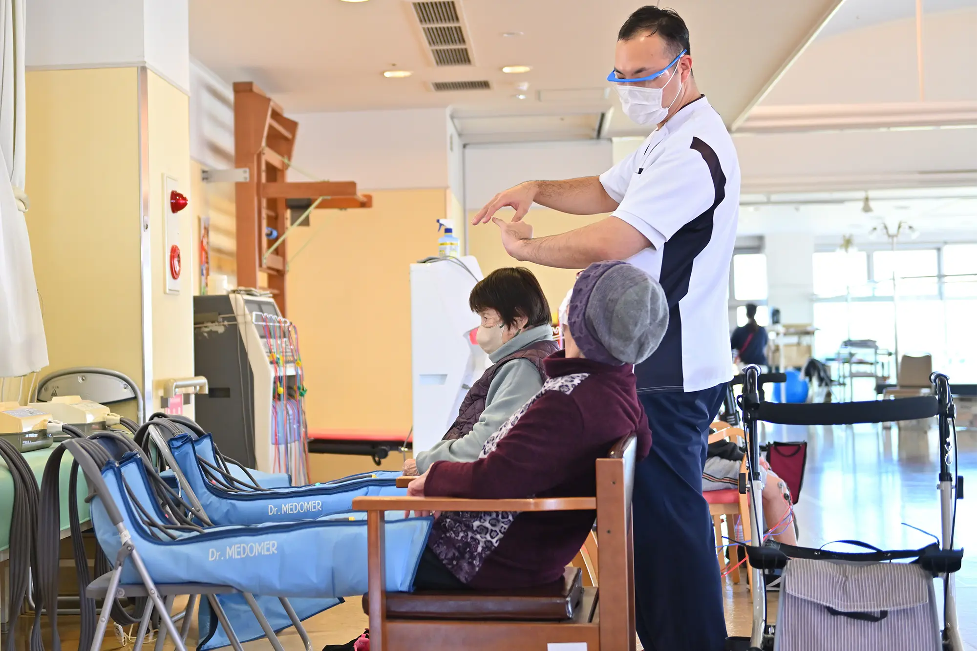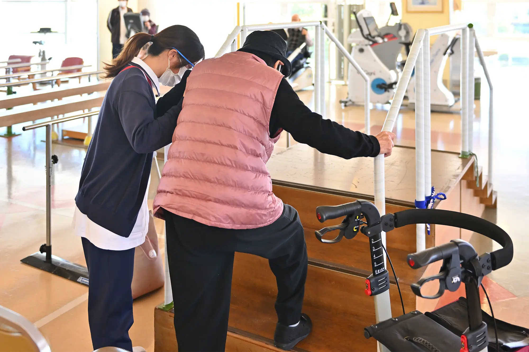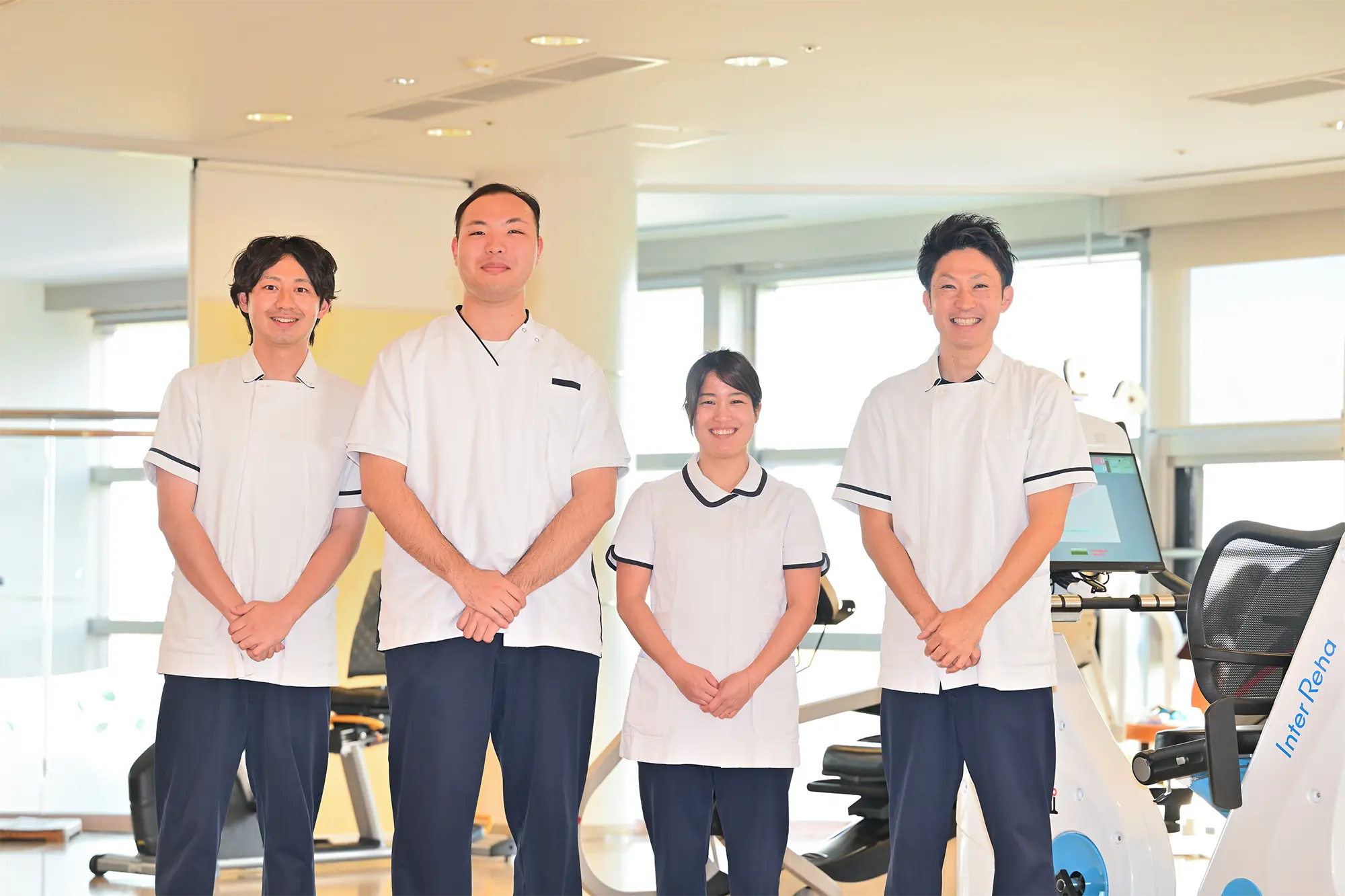 理学療法士(8名在籍)は、歩く・立つなどの日常生活の基本動作の向上・維持に向けて、作業療法士(3名在籍)は、日常生活の応用動作・認知機能などの向上・維持に向けて、言語聴覚士(1名在籍)は、言語・嚥下機能の向上・維持に向けて、医師・看護師・介護士・管理栄養士など他職種との協力体制の元、日々全力で取り組んでおります。